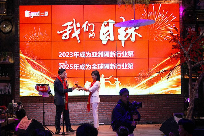 年会伊始,一固隔断总经理吴杰雄先生上台致辞,吴总回顾了2019年一固人的拼搏和奋斗,并对2020年的企业发展进行了详细规划,吴总对全体员工的努力表示肯定,对供应商、合作伙伴、朋友家人的支持表示了感谢,2019年取得的优异成绩,为2020的腾飞奠定了扎实的基础,新的一年,为满足日益扩大的生产销售需要,努力扩建第三厂区,加强内部人员培训力度,优化升级运营模式,吴总在发言中提出了一固隔断三年计划五年愿景,表示一固隔断将在2023年成为亚洲隔断行业第一,2025年成为全球隔断行业第一,希望全体家人携手同行,共赢未来!